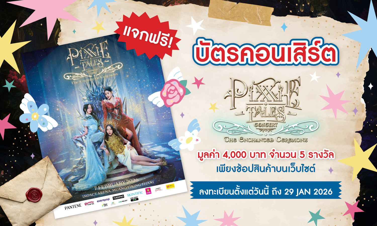 เพียงซื้อสินค้าใดก็ได้บนเว็บไซต์ https://happysunday.store/ (ไม่มีขั้นต่ำ) และลงทะเบียนคำสั่งซื้อภายในวันที่ 29 ม.ค. 69 มีสิทธิ์ลุ้นรับบัตรคอนเสิร์ต PiXXiE Tales Concert : The Enchanted Ceremony ราคาใบละ 4,000 บาท จำนวน 5 รางวัล (รางวัลละ 1 ใบ)